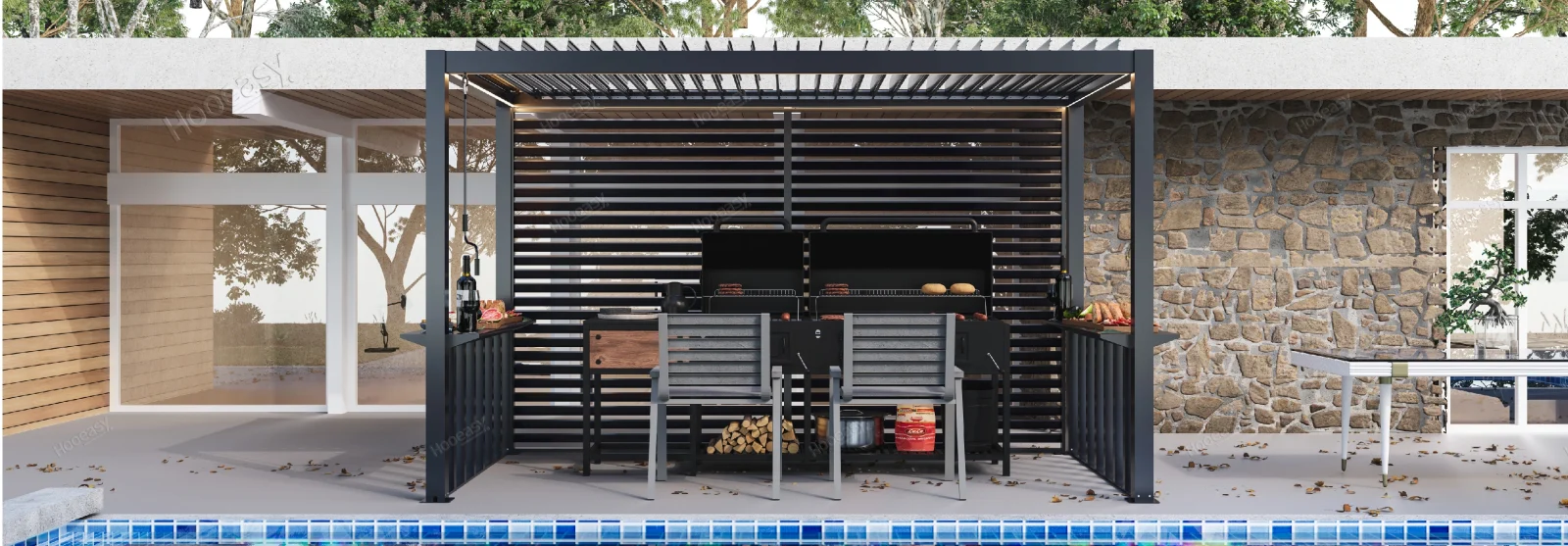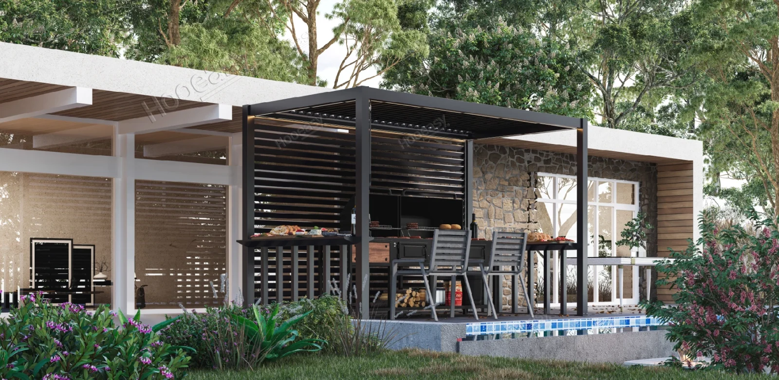 A barbecue grill pergola is a mini kitchen structure for an outdoor space. It differs from a traditional pergola because it has open sides tables and optional back wall.