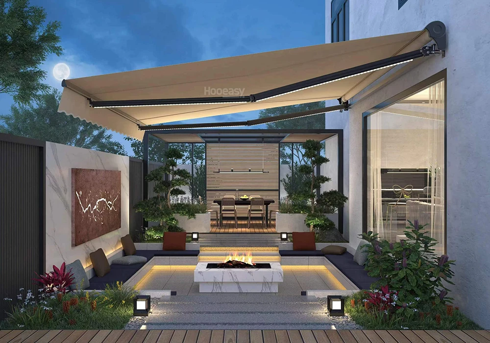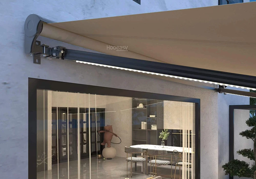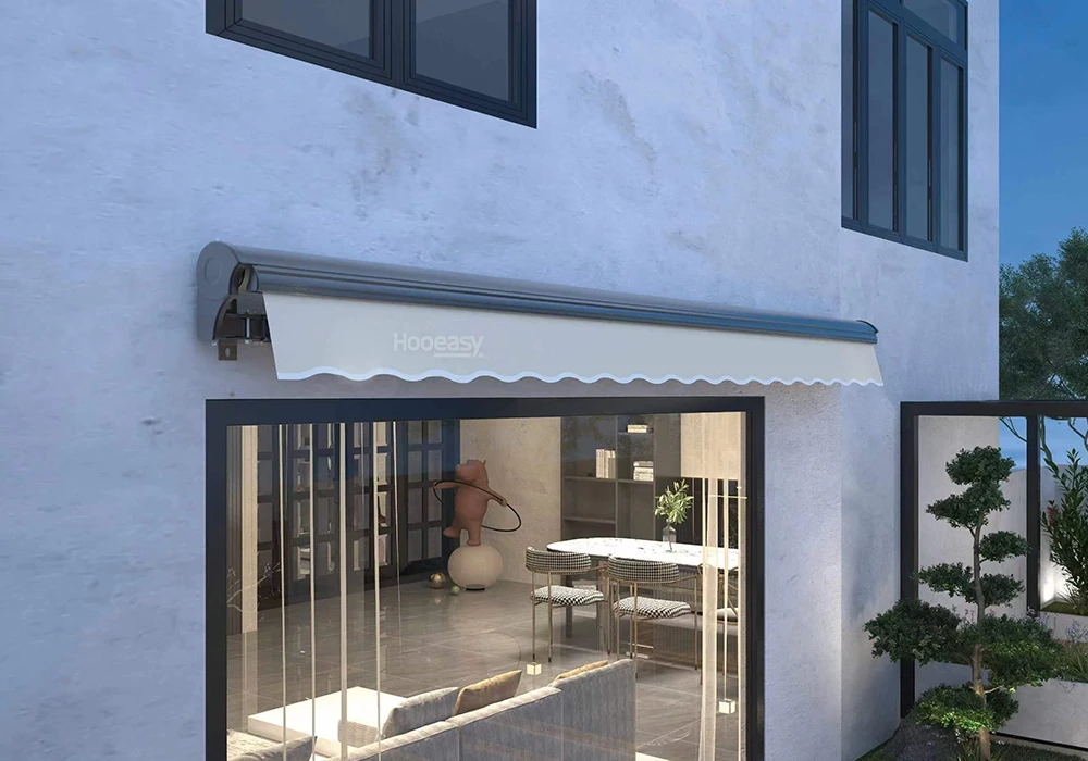 Hooeasy half-cassette retractable awning 3430L is a modern interpretation of the classic awning shape. The torsion bar is harmoniously integrated with the cassette, creating an elegant design piece.