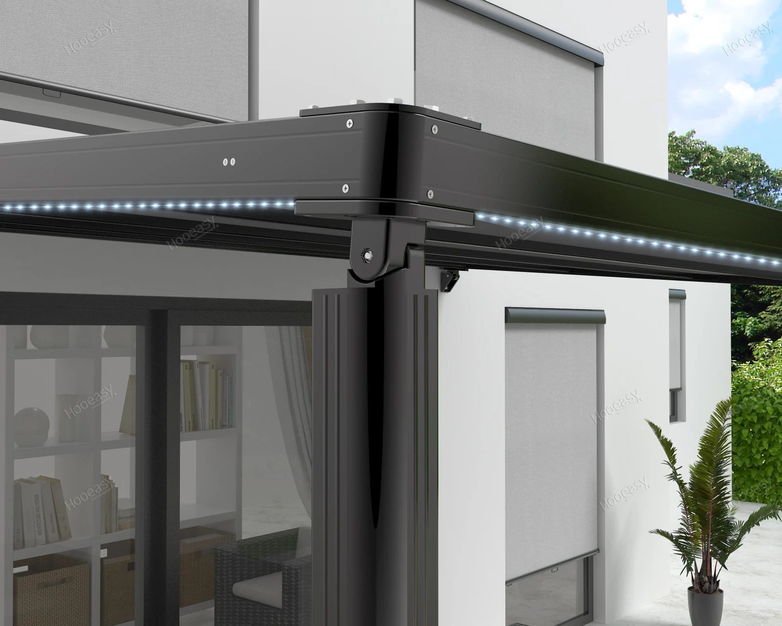 The rhythmic and space-saving folding technique creates large areas of shadow, creating a very special atmosphere. With the option of various equipment, the Hooeasy pergola awning can show its advantages in all aspects.