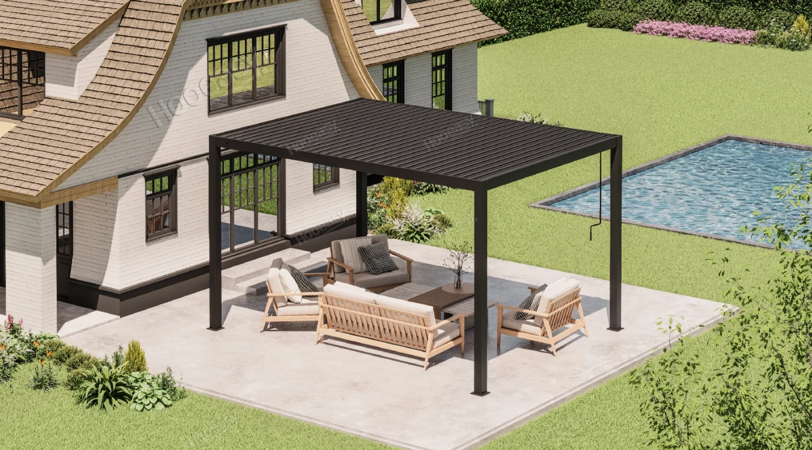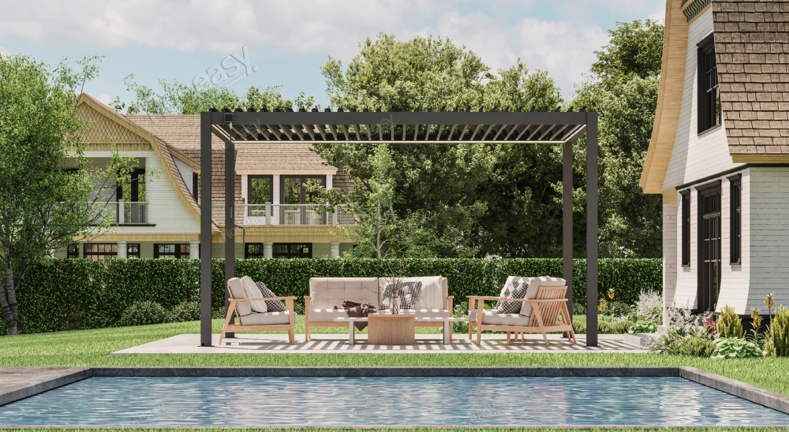 This Elegant Aluminum Pergola has one section roof. All components are made in aluminum or stainless steel, no worry about rust problem.